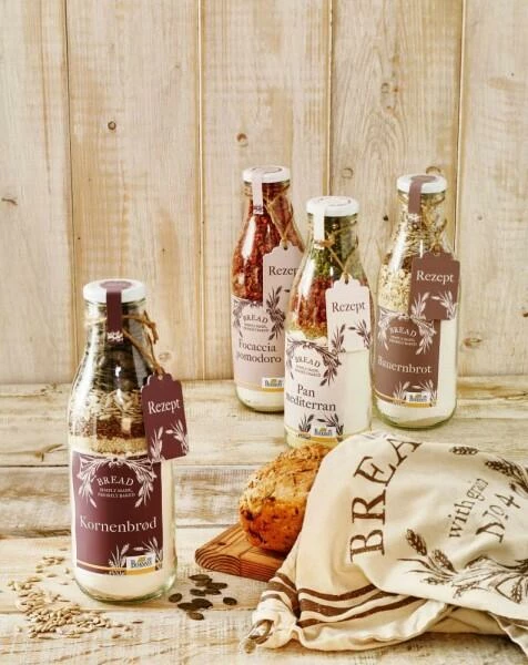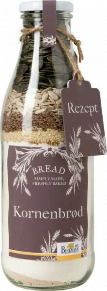 Die Brotbackmischung im Glas ist nicht nur ein echter Hingucker, sondern schmeckt auch noch köstlich. Aufgrund ihrer besonderen Verpackung – in einer Glasflasche – ist diese Backmischung das perfekte Geschenk für jeden Anlass. Darüber hinaus lassen sich alle Zutaten bestens erkennen – nur Flüssigkeit muss noch hinzugefügt werden. Da die Flasche mit der exakten Menge der Zutaten für ein Brot befüllt ist, geht die Zubereitung und das Backen des Körnerbrots super schnell und leicht von der Hand. Dabei hilft zusätzlich das mitgelieferte Rezept.