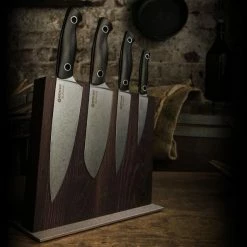 Bestückter Böker Messerblock Saga Grenadill mit vier Messern der Serie Böker Saga Grenadill: Spickmesser, Allzweckmesser, Santoku, Chefmesser.