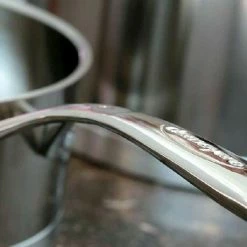 Gegossene Handgriffe aus Edelstahl 18/10: Durch ihre Form und Ausführung aus “gegossenem” Edelstahl 18/10 bleiben die Griffe auf Elektrokochplatten meistens ausreichend kühl. Sie wurden entwickelt, um die Wärmeleitfähigkeit minimal zu halten, damit man sie besser ohne Risiko anfassen kann (50°C). Vorsicht bei Gasbrennern… Flammen, die über den Rand des Bodens lecken, können die Griffe schon erhitzen. Beim Abwaschen bleibt nie Wasser in den Griffen zurück.