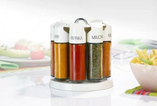 Das robuste und langlebige Gewürzkarussell ermöglicht es, die beliebstesten Gewürze bei Tisch und in der Küche stets griffbereit zu haben. Die Oberfläche des Gestells ist aus versiegeltem Buchenholz gefertigt, das kratzfest und feuchtigkeitsabweisend ist. Die 8 Gewürzgläser, die mit Salz, Pfeffer, Paprika, Chili, Oregano, Majoran, Curry und Kräutersalz gefüllt sind, verfügen über einen luftdichten Aromasafe-Verschluss und ein praktisches Streusieb.