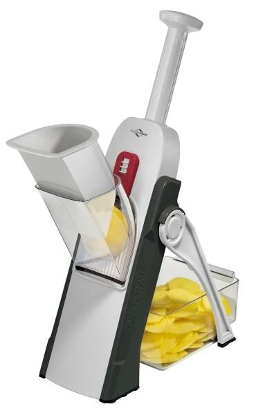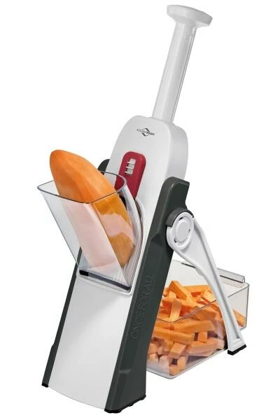 Küchenprofi Süßkartoffel-Hobel RAPID. Zum Schneiden von Scheiben und Stiften. Ideal zum Hobeln von hausgemachten Pommes aus Süßkartoffeln. Zerkleinert auch anderes Gemüse wie Karotten, Gurken, Zucchini, Rote Beete.