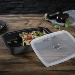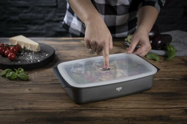 Dank des praktischen Kunststoffdeckels aus PP und Silikon können Aufläufe schnell im Kühlschrank oder in der Gefriertruhe verstauen werden! Ein Ventil im Deckel lässt Restwärme entweichen. Durch Runterdrücken entsteht ein leichtes Vakuum, welches Form und Deckel luftdicht miteinander verbindet.