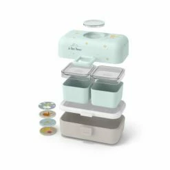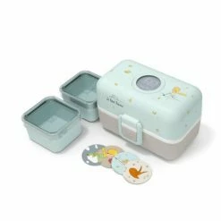 Modular und ultrakompakt: Die Monbento Bentobox Tresor für Kids passt sich mit seinem mikrowellentauglichen, hermetisch dichtem Behälter und den beiden Kästchen an die gastronomischen Vorlieben der Kleinen an. Die Bento-Box aus hochwertigen Kunststoff liegt dank der Soft Touch-Beschichtung besonders gut in der Hand. Die Lunchbox besteht aus einem Behälter, Zwischendeckel und zwei kleinen Kästchen. Dadurch können Mahlzeiten ganz individuell zusammengestellt werden: Ob ein frisch belegtes Pausenbrot, knackiges Obst oder Gemüse-Variationen – in dieser auffallend bunten Lunchbox schmeckt das Essen doppelt so gut!