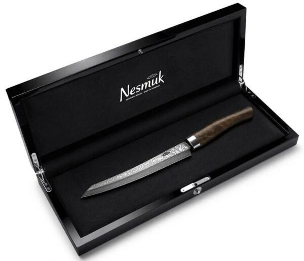 Nesmuk verbindet traditionsreiche Handwerkkunst mit modernster Technologie. Das Unternehmen aus Solingen entwickelt und fertigt Messer in höchstmöglicher Schärfe und setzt dabei auf Stahlsorten, Edel-Materialien und Technologien, die in der Schneidwarenindustrie noch nie zuvor verwendet worden sind – und genau das macht den Unterschied! Alle Messer werden unter dem Anspruch gefertigt, in ihrer Schärfe nicht überboten werden zu können und in jedem Anwendungsbereich den feinstmöglichen Schnitt zu ermöglichen. Die Produkte entstehen in mühevoller, mehrjähriger Detail-Arbeit. Alle Produkte sind mit praktischen und dekorativen Alleinstellungsmerkmalen ausgestattet und genießen den Ruf, jeweils die Besten in ihrer Kategorie zu sein! Sie sind zeitlos, funktional und von höchster Qualität. Es macht keinen Unterschied, ob das Messer links- und rechtshändig geführt wird. Zusätzlich bietet Nesmuk eine Vielzahl an praktischen Zubehör zum Schärfen, Aufbewahren, Pflege sowie Arbeiten wie z.B. Streichriemen, Messerhalter und Schneidbretter an.