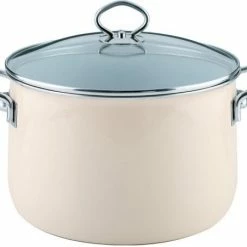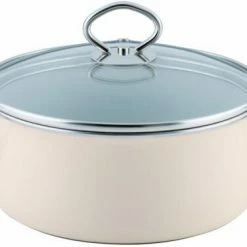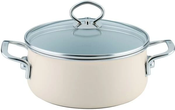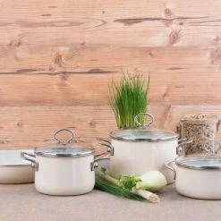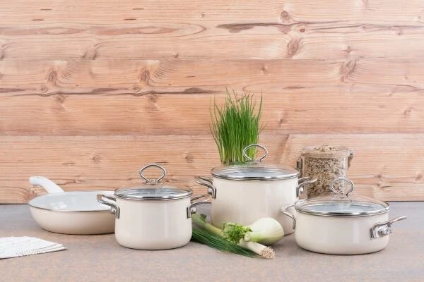 Riess Geschirr-Set aus Emaille, 5-tlg. in avorio. 4 Töpfe und 1 Pfanne aus Emaille, Edelstahl und Glas.