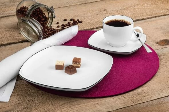 Das edle und zeitlose Kaffeeservice für 6 Personen beinhaltet 6 Kaffeetassen (0,21 l), 6 Untertassen eckig (14,5 cm) sowie 6 Frühstücksteller eckig (20 cm).