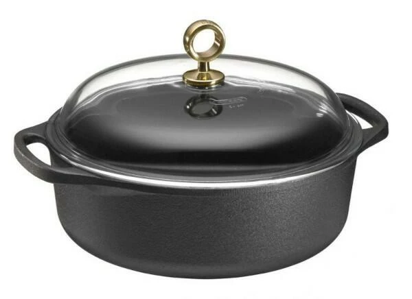 Bräter rund mit Glasdeckel und Messinggriff. Der formvollendete Bräter aus Gusseisen – hergestellt ganz ohne Farben oder Chemikalien.