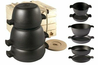 Skeppshult Topfstapel „Grytstapeln” hat fast alles, was der Gusseisenliebhaber zum Einstieg oder zur Erweiterung seines Sortiments benötigt. Einfach Gusseisen pur in 6 Teilen: Omelettepfanne, Kochtopf 3,0 l, Bratpfanne, Kochtopf 4,5 l, Tiefe Pfanne 3,5 l und Grillpfanne.
