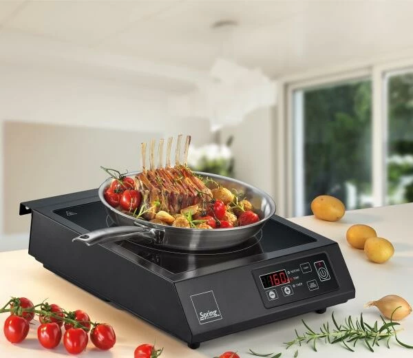 Spring macht die Benutzung des Geräts für Hobbyköche, wie auch für Profis, besonders einfach. Für volle Flexibilität im Kochvorgang verfügt das Kochfeld über eine Warmhalte- sowie Timerfunktion. Ein großes LED-Display und das abgeschrägte Bedienfeld mit Touchpanel erleichtern die Nutzung.