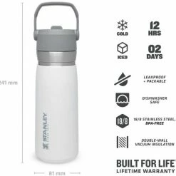 Die Stanley ICEFLOW FLIP STRAW WATER BOTTLE ist die perfekte Wahl für kalte Getränke beim Sport, in der Natur oder einfach beim Unterwegs sein. Das ausklappbare Mundstück – gleichzeitig Verschluss der Flasche – ist im inneren mit einem Kunststoff-Trinkhalm ausgestattet, wodurch die Flasche beim Trinken nicht gekippt werden muss. Zum einfachen Transportieren ist der Deckel mit einem praktischen, beweglichen Tragegriff ausgestattet. Die Trinkflasche aus rostfreiem 18/8-Edelstahl mit Vakuumisolierung besitzt ein Fassungsvermögen von 650 ml und hält Getränke bis zu 12 Stunden gekühlt. Die ICEFLOW FLIP STRAW WATER BOTTLE ist komplett spülmaschinenfest und auslaufsicher. BPA-frei.