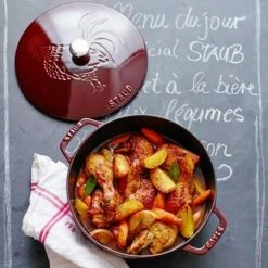 Staub Bräter La Marmite mit Hahn-Dekor in grenadine. Schmortopf von Staub für die schonende und schmackhafte Zubereitung leckerer Eintöpfe und Gerichte. Mit kunstvollem “Le Coq Français”-Motiv auf dem Deckel und Deckelstruktur Chistera Drop-Structure.