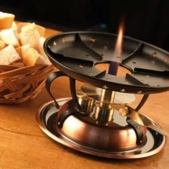 Der klassische Rechaud von Stöckli ist kupfer brüniert, verfügt über einen exakt einstellbaren Spritbrenner mit Docht, einen großen Spritmessbecher, eine Löschkappe mit Kette und praktischerweise auch über eine Tragegriff sowie Windschutz. Der rustikale Rechaud ist Swiss-made!
