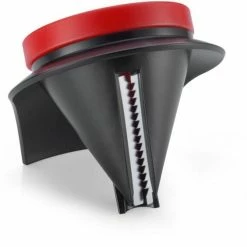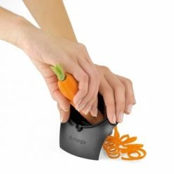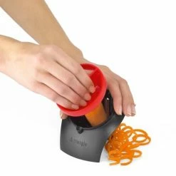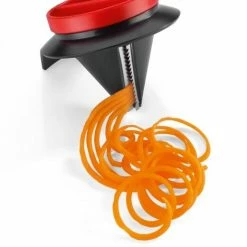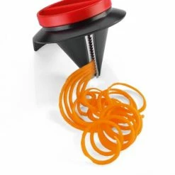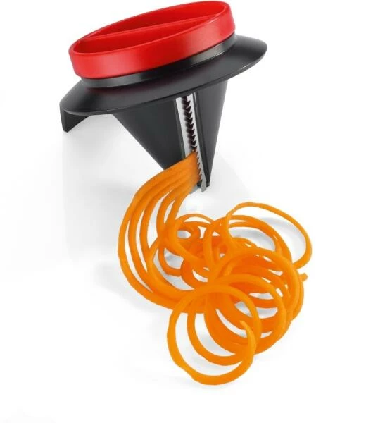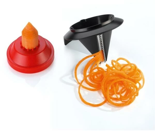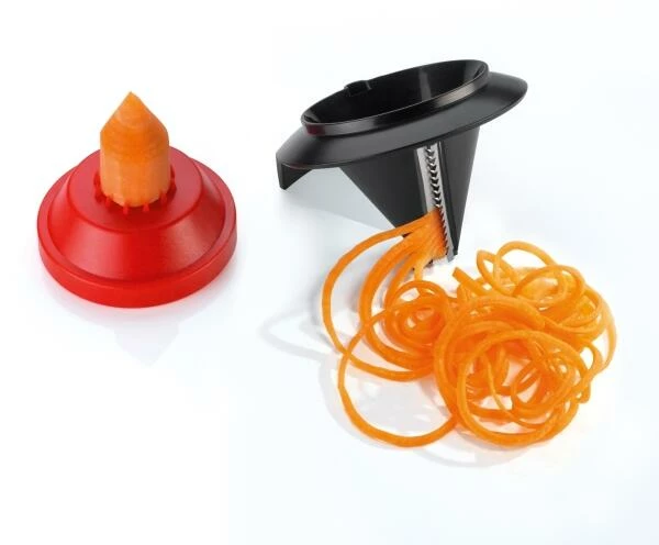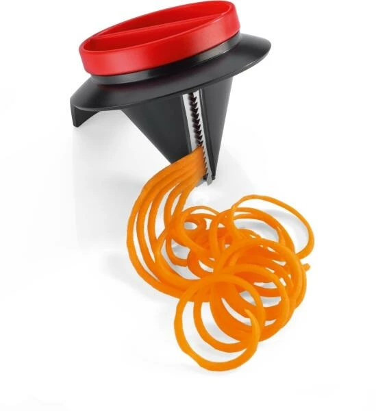 Für perfekt geschnittene, endlos lange Gemüsespaghetti. Für ein optimales Ergebnis den Schneider auf den Standfuß stellen und mit einer Hand fixieren. Mit der anderen Obst oder Gemüse in die Öffnung stecken und um die eigene Achse drehen.Der Restehalter sorgt für minimalen Verlust und sichere Anwendung bis zum Schluss. Öffnung Ø 7,5 cm, rostfreie Edelstahl-Klingen, spülmaschinenfest.
