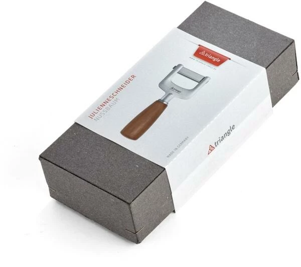 Gleichmäßige Gemüsestreifen für die kreative Küche. Mit dem Julienneschneider werden Möhren, Zucchinis, Rettiche, Rote Beete und andere Gemüsearten in gleichmäßig feine, 3mm dünne Streifen geschnitten. Der Julienneschneider wird ganz unkompliziert wie ein Sparschäler verwendet und hilft bei der Herstellung von Gemüsespaghetti, Garnituren, Gemüsenestern oder Suppeneinlagen. Der Kreativität sind keine Grenzen gesetzt. Die hochwertig gehärtete, extrem scharfe Klinge bewältigt auch harte Gemüse spielend und sehr bleibt lange scharf. Auch größeren Mengen schneiden sich völlig ermüdungsfrei. Für Soul verwendet triangle Holz von regionalen Obstwiesen und unterstützt damit eine nachhaltige Holzwirtschaft und kurze Transportwege. Die Griffe werden im Sauerland gedrechselt, anschließend in Solingen fein bearbeitet und mit Funktionsteilen aus Edelstahl konfektioniert. Gefertigt wird selbstverständlich mit Ökostrom.