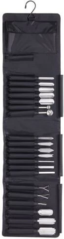 Das triangle Schnitzmesser-Set Artist bietet mit 20 unterschiedlichen Schnitzmessern nahezu unendliche Möglichkeiten. Die Messer bestehen aus gehärtetem, rostfreiem Stahl, sind hochwertig verarbeitet und perfekt geschärft. Die rutschfesten Griffe mit Santoprene-Griffzone gewährleisten selbst mit nassen Händen präzises Arbeiten. Der sichere Aufbewahrung dient eine schwarze Nylon-Rolltasche, die mittels eines angebrachten Hakens sogar aufgehängt werden kann und Stauraum für zusätzliche Werkzeuge oder Visitenkarten bietet. Ein weiterer freier Platz für ein (Thai-)Messer nach Wahl ist in der Tasche vorgesehen. Alle Werkzeuge und Messer sind rostfrei und spülmaschinengeeignet. Inhalt: 5 Schnitzmesser A1 bis A53 Schnitzmesser E1 bis E31 Schnitzmesser D2 Schnitzmesser F1 und F21 Schnitzmesser G11 Schnitzmesser H11 Schnitzmesser I12 Kugelformer 12 mm und 20 mm1 Keramikwetzstein3 Schlingenmesser L2 -L41 Nylon-Rolltasche