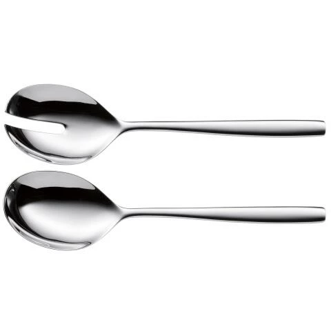 WMF Salatbesteck Palma. Durchmischen, aufgreifen, servieren: Keine Frage, zu einem frischen Salat gehört ein Salatbesteck. Es ist stets zweiteilig, wobei seine flachen, äußerst großzügig gestalteten Laffen die leichte Aufnahme des Salats ermöglichen und zwar so, dass überschüssiges Dressing vor dem Servieren leicht abtropfen kann. Die langen Stiele des Bestecks sorgen für bequemes Hantieren und verhindern zugleich, dass es in die Salatschlüssel rutscht.