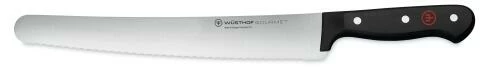 Wüsthof Konditormesser Gourmet. Ideal zum Backen, Glasieren sowie zum Aufschneiden von Tortenböden oder -stücken. Das Konditormesser mit seiner langen, gewellten und leichten Klinge schneidet sehr sauber durch Kuchen und Torte. Auch das horizontale Zerteilen von Tortenböden fällt damit leicht. Mit der gerade Seite des Konditormessers können Glasuren und Cremes großflächig verteilt werden.