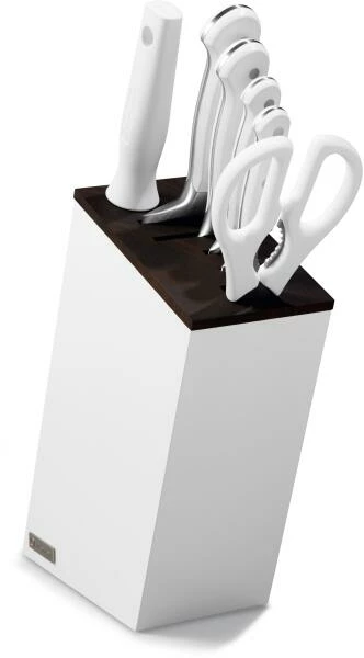 Wüsthof Messerblock Classic White mit 6 Teilen. Gut geschützt und immer griffbereit bewahren Sie Ihre Messer im Holzblock aus massiver Buche auf. Ein Blickfang in jeder Küche. Dank der schräg abgeflachten Form des Messerblocks können die Messer mit einer Handbewegung einfach entnommen und wieder in die praktischen Schubfächer gesteckt werden.