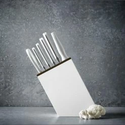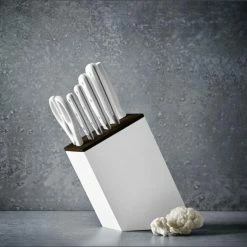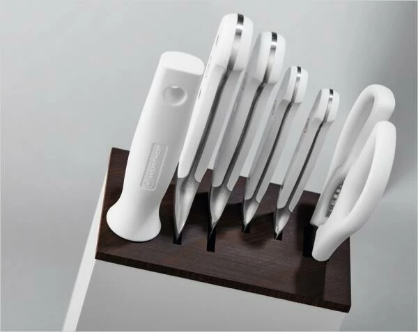 Wüsthof Messerblock Classic White mit 6 Teilen. Gut geschützt und immer griffbereit bewahren Sie Ihre Messer im Holzblock aus massiver Buche auf. Ein Blickfang in jeder Küche. Dank der schräg abgeflachten Form des Messerblocks können die Messer mit einer Handbewegung einfach entnommen und wieder in die praktischen Schubfächer gesteckt werden.