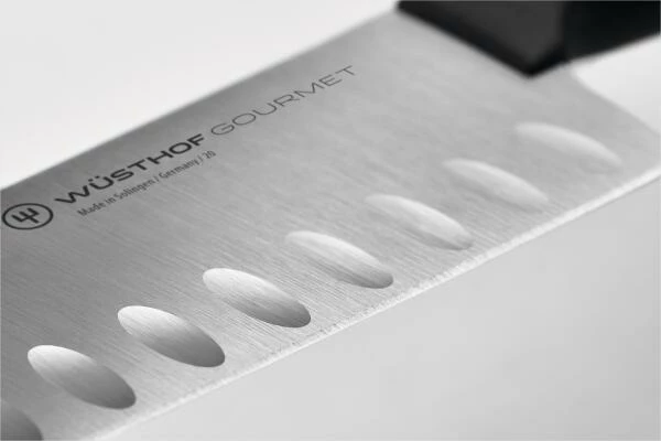 Das Santoku ist ein vielseitig einsetzbares Messer mit Kullenschliff. Ideal für feinste Schneidarbeiten in der Küche. Durch die Kullen entstehen Luftpolster, die das Ankleben von dünnen und weichen Scheiben auf der Klinge verhindern