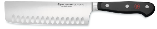 Wüsthof aus der Serie Classic mit Kullenschliff. Das Nakiri ist das japanische Gemüsemesser. Als solches ist es extrem vielseitig und eignet sich für Aufgaben wie Schneiden, Würfeln oder Hacken. Von der Form her erinnert es ein wenig an ein Hackebeil, darf mit diesem aber nicht verwechselt werden. Ein Nakiri eignet sich nicht für grobe Aufgaben (z.B. das Zerteilen von Knochen). Die sehr scharfe und fein geschliffene Klinge hilft viel eher dabei, Gemüse, Kräuter und Obst sehr schnell, aber auch sehr filigran zu verarbeiten. Der Kullenschliff (kleine Vertiefungen im Klingenblatt, die beimSchneiden kleine Luftpolster bilden) des Messers verhindert zudem ein Anhaften der Zutaten.