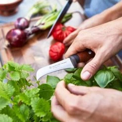 Der Griff aus nachhaltig angebauter und thermisch behandelter Buche ist extrem widerstandsfähig und Wasser abweisend. Kombiniert mit dem rutschfesten Kropf gibt er einen sicheren Halt. Alle Messer sind gut ausbalancierte, komfortable und effiziente Werkzeuge, die sich ideal für Gemüse und Fleisch eignen oder wie das einzigartige Erntemesser zum Pflücken von Gemüse, Früchten oder Kräutern im eigenen Garten.