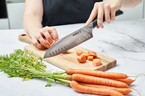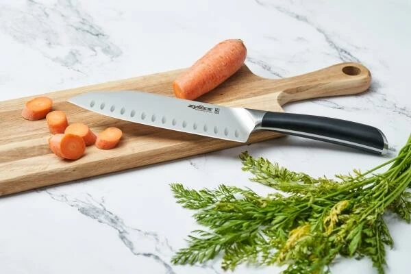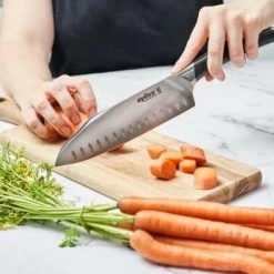 Das Comfort Pro Santokumesser verfügt über mehrere Vertiefungen entlang der Klinge, um weniger Essensreste zu gewährleisten. Die eisgehärtete 15° Klinge aus deutschem Edelstahl gleitet durch Lebensmittel, die normalerweise schwerer zu schneiden sind, wie z.B. Butternusskürbis. Der ergonomische Griff wurde für höchsten Komfort beim täglichen Gebrauch entwickelt. Er liegt perfekt in der Hand und verfügt über ein sich verjüngenden Kropf, der beim Gebrauch einen festen Halt ermöglicht. Die Fingerauflage an der Klinge bietet eine bequeme Position zum Platzieren des Zeigefingers.